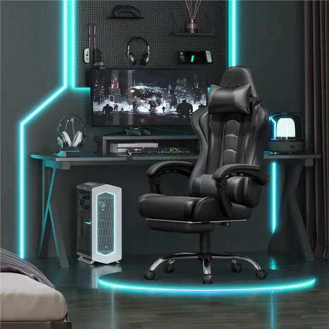 This Ergonomic Gaming Chair is designed to enhance your workspace or gaming setup with advanced comfort and support. Crafted from PU leather, metal, foam, polyester fiberfill, and plywood, this high-back office chair features a racing-inspired silhouette and a wide, sturdy base for stability. The adjustable seat height, reclining backrest that can be adjusted up to 135 degrees, and slide-out footrest allow for personalized relaxation. Additional highlights include a removable head pillow, a massage lumbar pillow, and padded armrests for ergonomic support. With a 300 lb weight capacity and smooth-rolling mute castors, this chair is suitable for home offices, studies, dorms, and more, offering both durability and convenience.