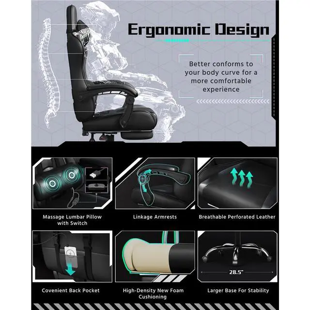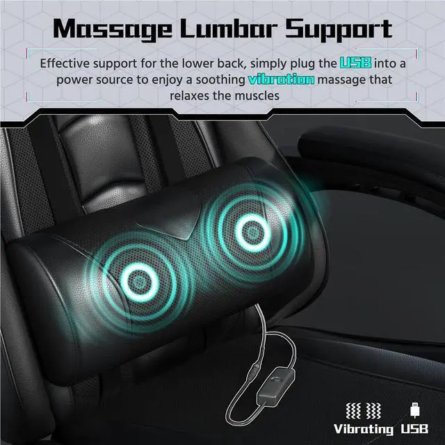 - Massage Lumbar Cushion and Extendable Footrest: The lumbar pillow includes a massage function activated by a USB switch to help ease fatigue, while the fold-out cushioned footrest provides added relaxation; a back pocket keeps the cable and small essentials organized