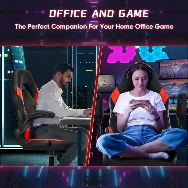 DIXSG gaming chair features a comfortable design with multi-line elements and a hollowed-out back made of breathable PU leather. The cushion is thick and contoured to fit the curve of the hip, and the two-color combination design adds visual appeal. The chair helps you find a relaxed sitting position for long gaming or work sessions. It has adjustable height and flip-up armrests for space-saving convenience. Constructed of sturdy chrome-plated metal, it can support up to 275 lbs and features pentagonal casters for stability and mobility. Weighing only 30 pounds, it is portable and versatile for entertainment, movie-watching, work, and rest.