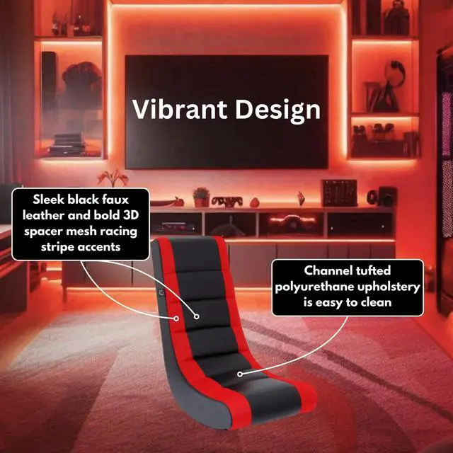 Introducing The Crew Furniture Classic Video Rocker Gaming Chair, the ultimate seating solution for young gamers! Designed specifically for kids and teens, this video rocker gaming chair combines style, comfort, and functionality to elevate their gaming experience. Upholstered in premium PU faux leather and polyester mesh, this rocking floor gaming chair offers a sleek and durable finish that is easy to clean and maintain. This gaming chair video rocker features an ergonomic design that contours to the body, providing excellent support and reducing fatigue during long gaming sessions. The vibrant black and bold accent color combination adds a dynamic touch to any room, making it a standout piece in any gaming setup or kid's room. Lightweight and portable, this video rocker for kids and teens can be easily moved from the living room to the bedroom, or wherever their gaming adventures take them.The sturdy construction, featuring a one piece sustainable forestry engineered wood frame and recycled polyester fiber padding, ensures long-lasting use and comfort for eco-conscious families. Additionally, the non-marking base protects floors from scratches and scuffs, making it a practical choice for any home.Ready to use right out of the box, theres no assembly required, allowing kids to start enjoying their new video gaming chair for kids immediately. Perfect for playing video games, watching movies, reading, or just lounging around, this versatile floor rocker gaming chair makes an excellent gift for birthdays, holidays, graduations, or any special occasion.Highly rated by users for its comfort, style, and durability, The Crew Furniture Classic Video Rocker Gaming Chair is the perfect addition to any young gamer's setup. Treat your child to the best in gaming comfort and style with this must-have gaming chair!