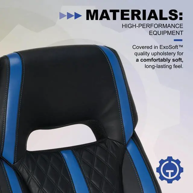 Level up your gaming setup with the Gamer Gear® Maven Gaming Chaira perfect blend of style and comfort designed for serious gamers. With its high-back design and contoured lumbar support, this chair has your back during marathon sessions, keeping you in the game longer without discomfort. Wrapped in smooth ExoSoft upholstery, the Maven offers a sleek, modern look while providing a cushy feel. The supportive pocket coil seat cushion ensures maximum comfort, while the padded ergonomic armrests flip up when you need extra space. Adjust your seat height with ease, and find your perfect angle with the recline lockout and tilt tension feature. The sturdy 5-star metal base and 360° dual-wheel casters give you full mobility, whether youre in the zone at your desk or kicking back to relax.