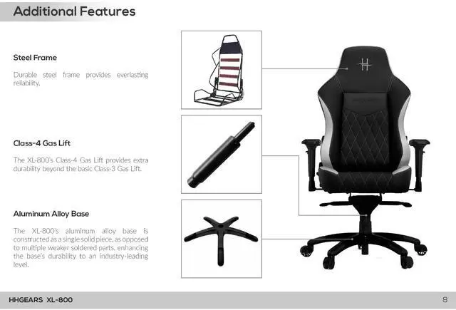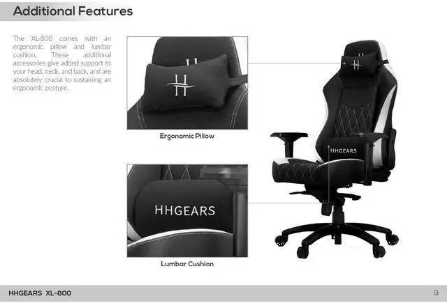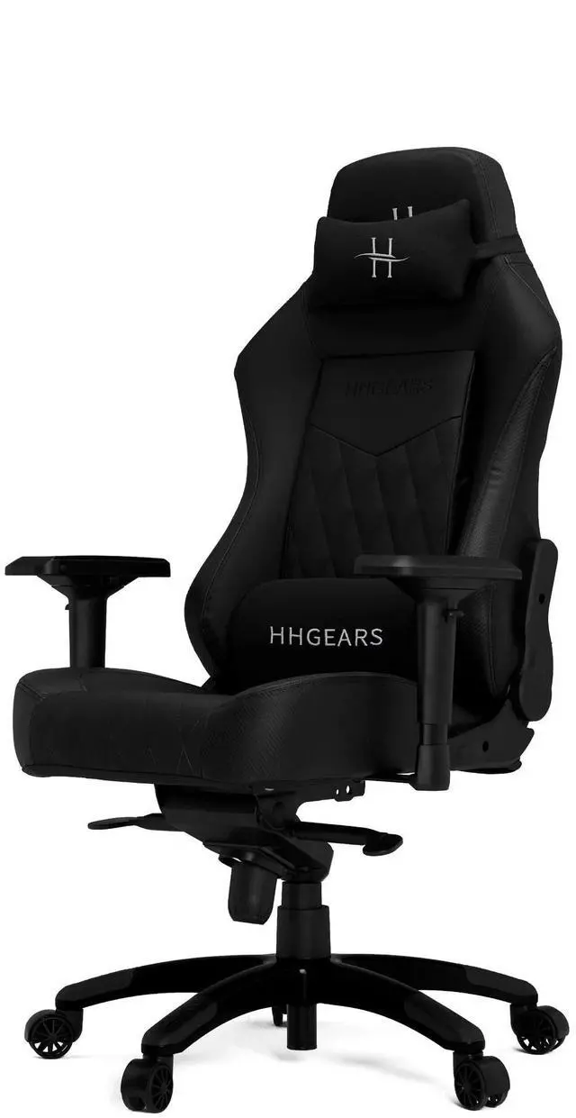 From PC games to VR, immerse yourself in any adventure while sitting in this HHGears XL 800 gaming chair. The ergonomic design is easy to adjust to your comfort level, so you can feel at ease during long and short playing sessions. Overall Dimensions: 51-7/8"H x 22-3/8"W x 19-9/16"D. Weight capacity tested to support 350 lb. Seat is padded with cold-cure foam for lasting cushioning. Waterfall seat cushion slopes slightly downward to help reduce stress on your legs. Ergonomic headrest pillow and lumbar cushion let you play in comfort. Lumbar pillow supports your lower back and enhances the natural curve of your spine. Crafted with a steel frame and an aluminum-alloy base. Faux leather gives the chair a stylish appearance. Height-adjustable seat is easy to raise and lower thanks to the Class 4 gas lift. Backrest tilts from 80° to 135°. Tilt resistance adjustment locks securely in place. Padded armrests can rotate and move up, down, forward and backward to suit your needs. Silent rubber casters glide smoothly over most floors. Meets and/or exceeds ANSI/BIFMA performance standards. Assembly required. Black design has diamond-patterned stitching for added style.