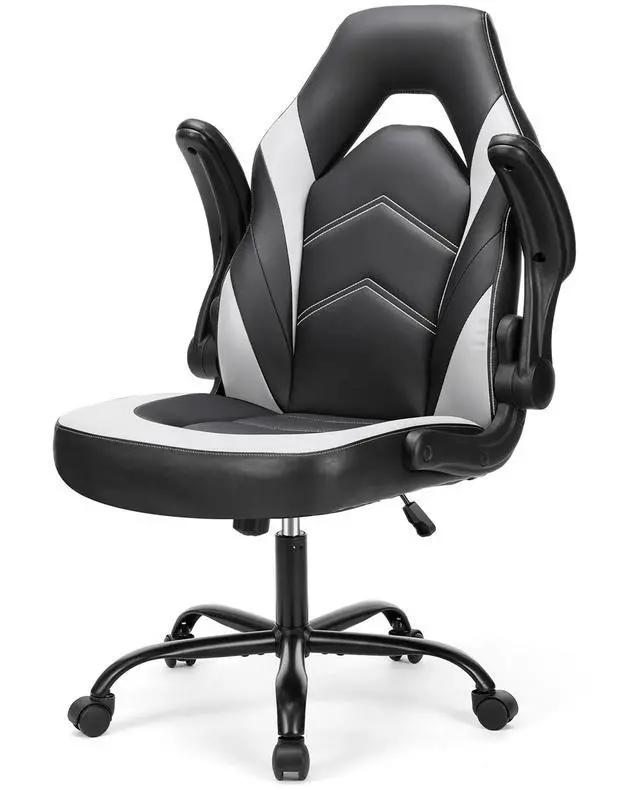 DIXSG gaming chair features a comfortable design with multi-line elements and a hollowed-out back made of breathable PU leather. The cushion is thick and contoured to fit the curve of the hip, and the two-color combination design adds visual appeal. The chair helps you find a relaxed sitting position for long gaming or work sessions. It has adjustable height and flip-up armrests for space-saving convenience. Constructed of sturdy chrome-plated metal, it can support up to 275 lbs and features pentagonal casters for stability and mobility. Weighing only 30 pounds, it is portable and versatile for entertainment, movie-watching, work, and rest.