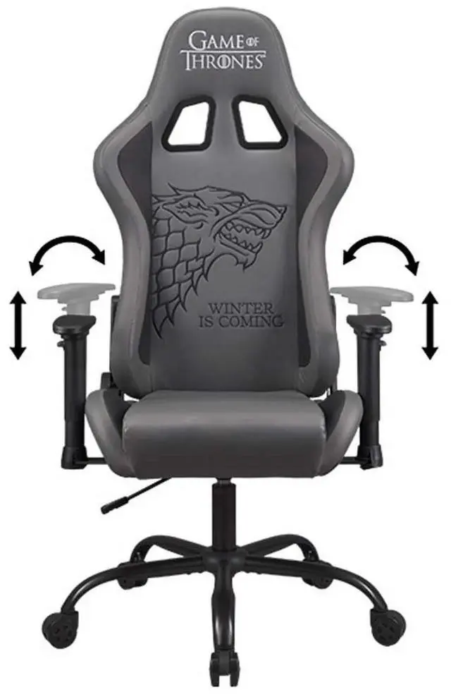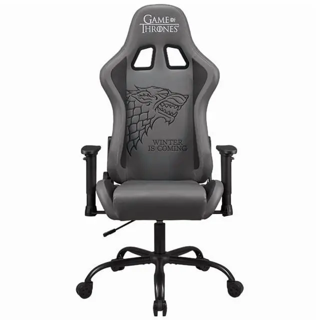 A seat for Game of Thrones fans, proudly displaying the Stark family crest.of the Stark family. Key features: Ergonomic, comfortable seating Adjustable armrests: 3D Easy-care leatherette upholstery. High-quality finish with embroidery and topstitching. Height and tilt adjustment. Immerse yourself in the epic world of Game of Thrones with this officially licensed gamer seat. Designed to provide comfort and style for avid gamers, this seat is the ultimate throne for fans of the series. The robust steel frame and Class 3 actuator ensure exceptional strength and durability, withstanding up to 110kg. The reinforced metal star base and nylon castors offer smooth stability and mobility, perfect for watching your favourite episodes of game of thrones on streaming. This gaming chair features the House of Stark crest and the famous phrase Winter is Coming, precisely embroidered on the high-quality leatherette backrest. The fully height-adjustable and swivelling armrests offer customised ergonomic support for optimum posture. Featuring a backrest that reclines up to 135 degrees, this gaming chair allows for fluid adjustments between periods of intense concentration and moments of total relaxation. Covered in high-quality imitation leather and filled with high-density foam, the Game of Thrones gamer chair offers superior comfort while reflecting the style of the series. The headrest features the iconic Game of Thrones logo, recalling the great houses of Westeros. Designed to effectively support posture and reduce muscle fatigue, this gaming office chair allows for extended gaming sessions without compromising comfort. Whether you're an early fan of game of thrones season 1 or have followed the storylines through to game of thrones season 8, this gaming chair is the perfect choice for those looking for the perfect combination of style, comfort and performance, inspired by the captivating world of Game of Thrones. Perfect for gamers who want to combine a passion for the series with an immersive gaming experience, this low-cost gamer seat offers exceptional quality at an affordable With this gaming bucket chair, plunge into the heart of Westeros and live out your adventures in royal comfort, worthy of the Iron Throne. The Game of Thrones gaming chair is the ultimate gaming chair for those looking for a stylish and ergonomic gaming office chair, ready to turn every gaming session into an epic quest through the Seven Kingdoms. Recommended size: 150 - 180 cm. Coating : Polyurethane Overall seat width: 67 cm Backrest height: 79 cm Backrest width: 45 cm Seat depth: 53 cm Seat width: 49 cm Seat height : Between 46 and 56 cm Armrest type : 3D Arm height : From the ground : between 66 and 76 cm Cylinder type : Class 3 Type of base : Métal 5 roulettes Base width : 72 cm Maximum recommended weight : 110 kg Seat weight : 14.5 kg Packaging dimensions : 79x28.5x52 cm Manufacturer's warranty : 2 years
