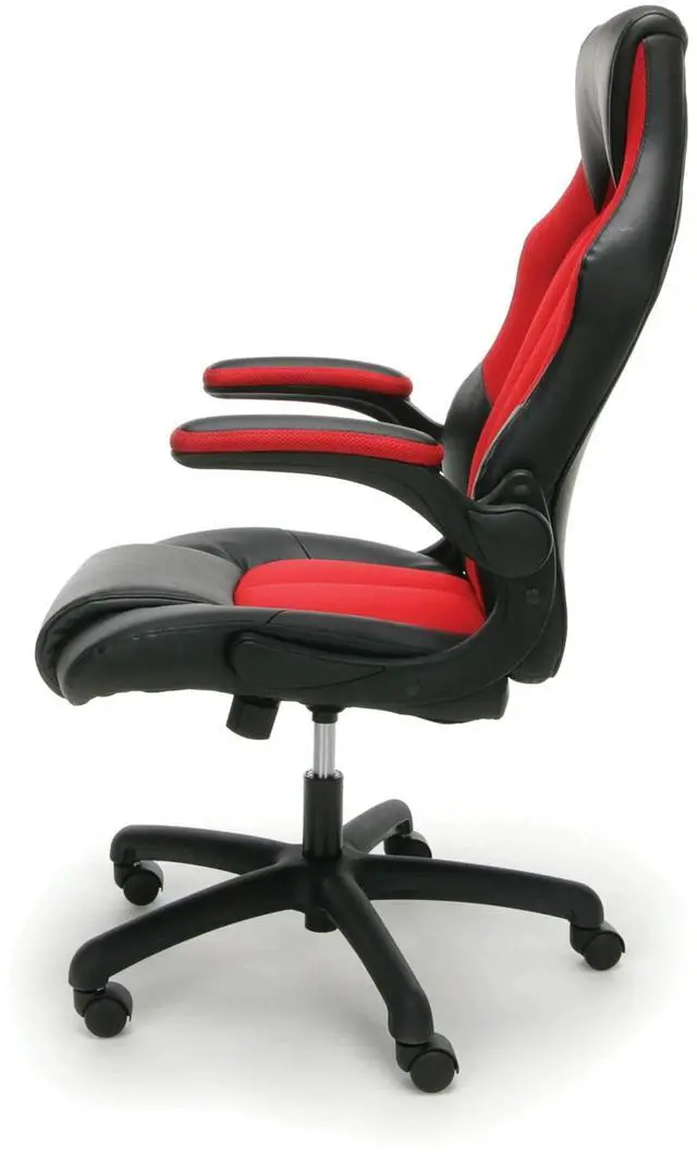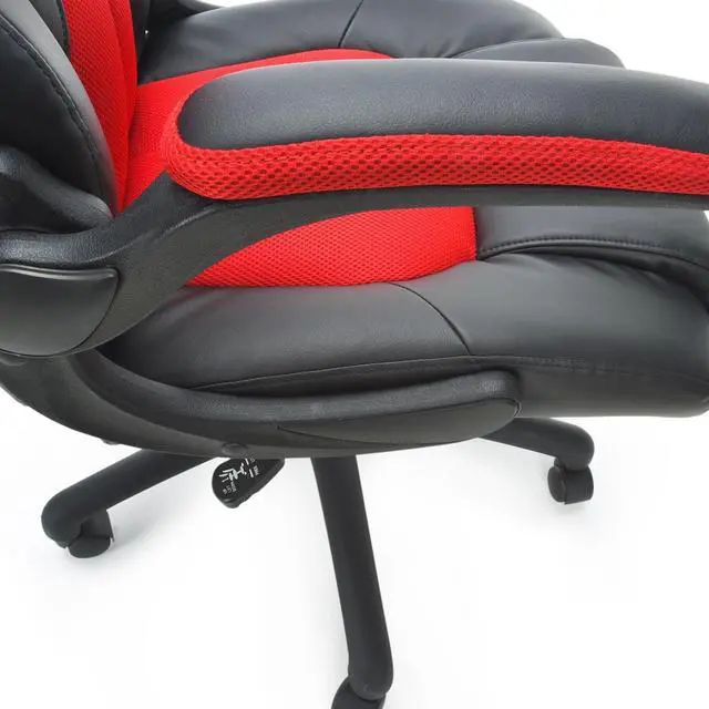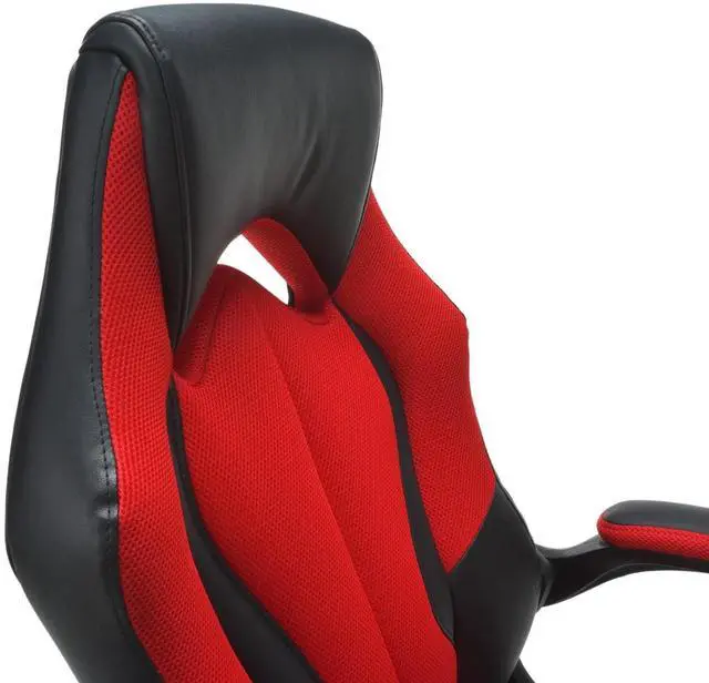 The DIXSG Essentials Collection seating is where quality meets value - and now it's taking the desk chair to a whole new level with the ESS-3086 series. This High-Back Racing Style Bonded Leather Gaming Chair, in Red, was designed with ergonomics in mind. With contoured segmented padding, a high back, and integrated headrest and lumbar support, this chair provides high-performance comfort whether used during intense gaming sessions or long work days. The thickly padded armrests can be left down for upper body support or flipped up to allow for uninhibited movement whenever you need it. Additional features include seat height adjustment, tilt-lock/tilt-tension control, and 360-degree swivel. SofThread Leather and contrasting color mesh upholstery complete the modern, high-quality look and feel. This chair is backed by the OFM Essentials 5-Year Limited Warranty and features a 275 lb weight capacity.