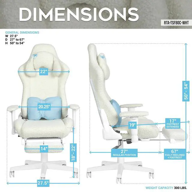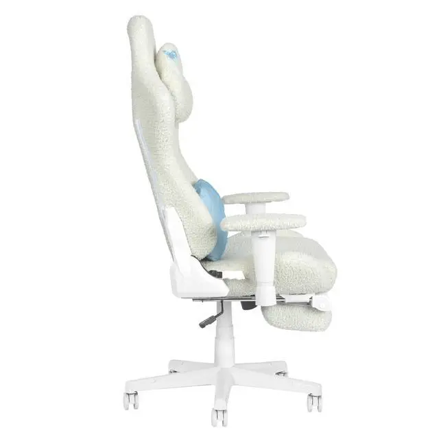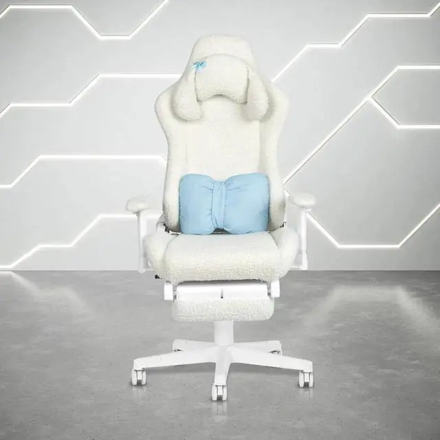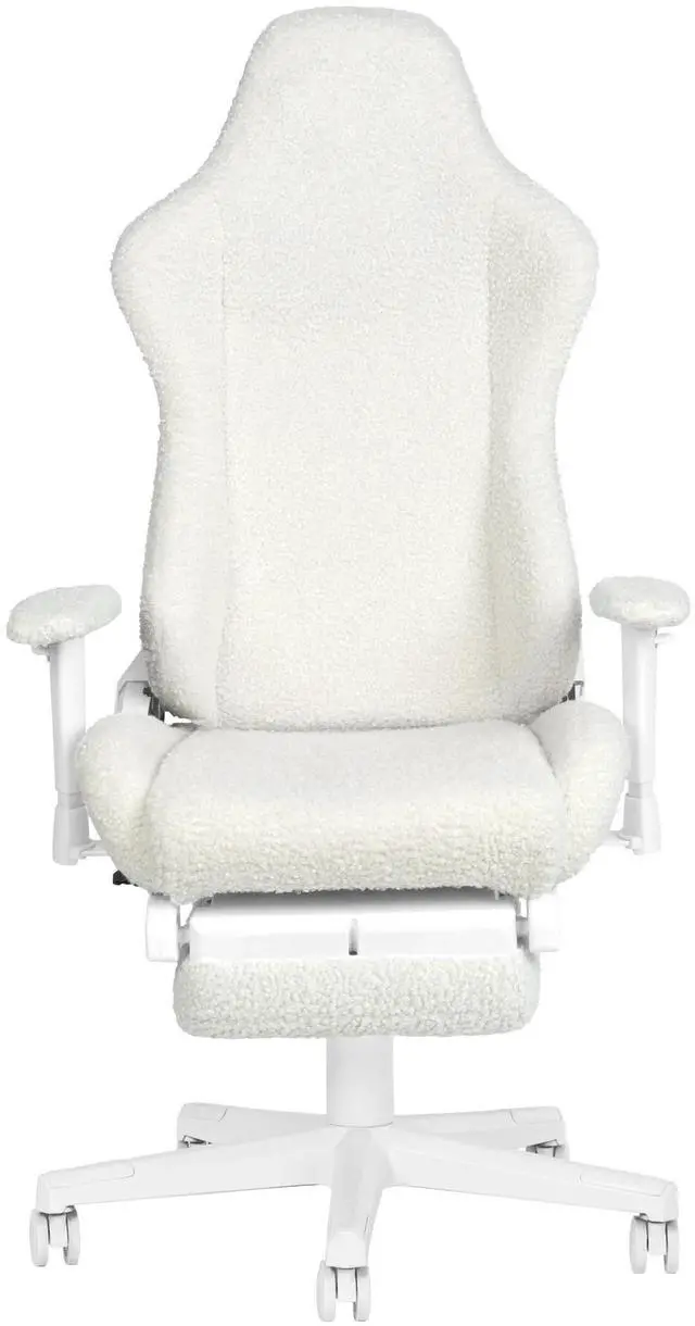 Step into comfort and cuteness with the Techni Sport White Bunny Chair a plush, ergonomic chair wrapped in soft bouclé fabric and designed to add a touch of charm to your everyday routine. Whether you're gaming, working, or relaxing, this cozy seat is your perfect companion. The whimsical bunny-ear headrest and pastel blue bow lumbar pillow add personality and comfort in all the right places. Underneath the adorable design is serious support: a memory foam seat, built-in headrest, and fold-out footrest for true all-day comfort. Adjustable features including armrests, seat height, reclining backrest, and tilt tension let you create your ideal seating position. And with a strong steel frame and 300 lbs weight capacity, this chair delivers both beauty and durability. Perfect for your bedroom, home office, or streaming space, the White Bunny Chair brings soft aesthetics and serious function together in one huggably cute package.