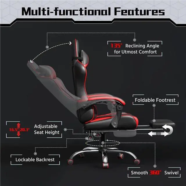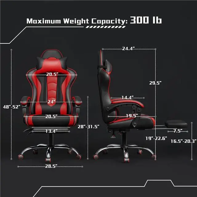 This Ergonomic Gaming Chair is designed to enhance your workspace or gaming setup with advanced comfort and support. Crafted from PU leather, metal, foam, polyester fiberfill, and plywood, this high-back office chair features a racing-inspired silhouette and a wide, sturdy base for stability. The adjustable seat height, reclining backrest that can be adjusted up to 135 degrees, and slide-out footrest allow for personalized relaxation. Additional highlights include a removable head pillow, a massage lumbar pillow, and padded armrests for ergonomic support. With a 300 lb weight capacity and smooth-rolling mute castors, this chair is suitable for home offices, studies, dorms, and more, offering both durability and convenience.