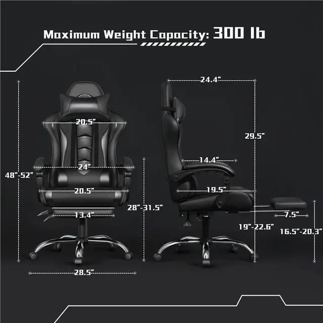 This Ergonomic Gaming Chair is designed to enhance your workspace or gaming setup with advanced comfort and support. Crafted from PU leather, metal, foam, polyester fiberfill, and plywood, this high-back office chair features a racing-inspired silhouette and a wide, sturdy base for stability. The adjustable seat height, reclining backrest that can be adjusted up to 135 degrees, and slide-out footrest allow for personalized relaxation. Additional highlights include a removable head pillow, a massage lumbar pillow, and padded armrests for ergonomic support. With a 300 lb weight capacity and smooth-rolling mute castors, this chair is suitable for home offices, studies, dorms, and more, offering both durability and convenience.