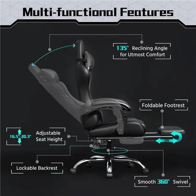 - Massage Lumbar Cushion and Extendable Footrest: The lumbar pillow includes a massage function activated by a USB switch to help ease fatigue, while the fold-out cushioned footrest provides added relaxation; a back pocket keeps the cable and small essentials organized