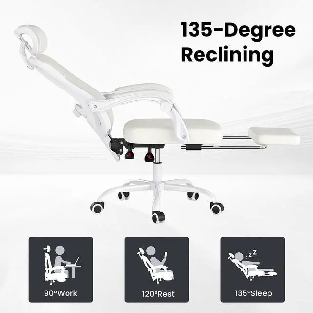 2, MESH HIGH BACK & RECLING - This computer desk chair back can be adjusted from 90 to 135 for your comfort, you can lock in any angle you want. Meanwhile 360 swivel wheels can be moved freely, the high back and headrest are both made of mesh, This ergonomic office chair is super breathable and giving you high resilience support