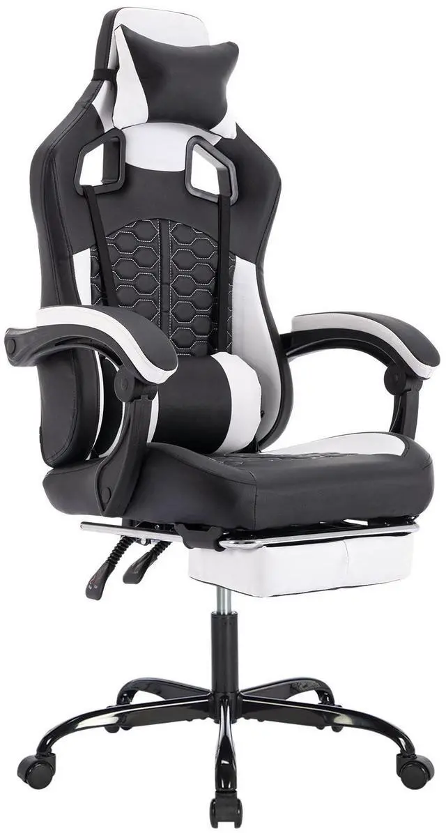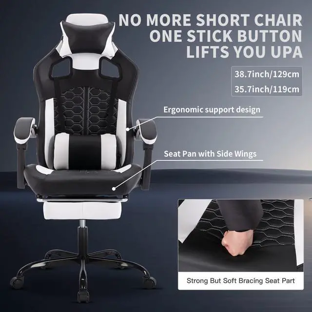 • Gaming Chair with Massage,Ergonomic PC Gaming Chair with Footrest Comfortable Headrest and Lumbar Support,High Back PVC Leather,300LBS (Black White)