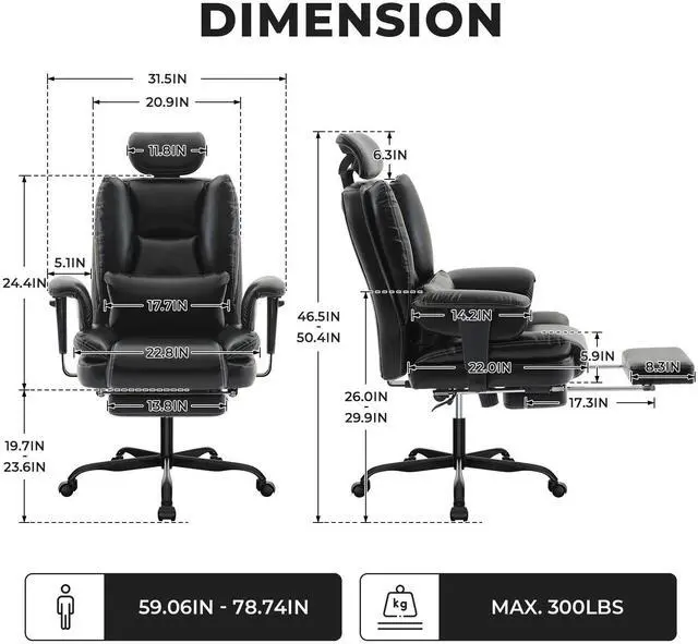 OFFICE CHAIR: Adjustable headrests and extendable footrests make our office chair even better. The chair's headrest can be adjusted up and down according to your needs, and the retractable footrest allows you to relax your legs and feet better so you won't feel tired at the end of the working day. This high back office chair can be used as a computer chair, executive chair or office chair.