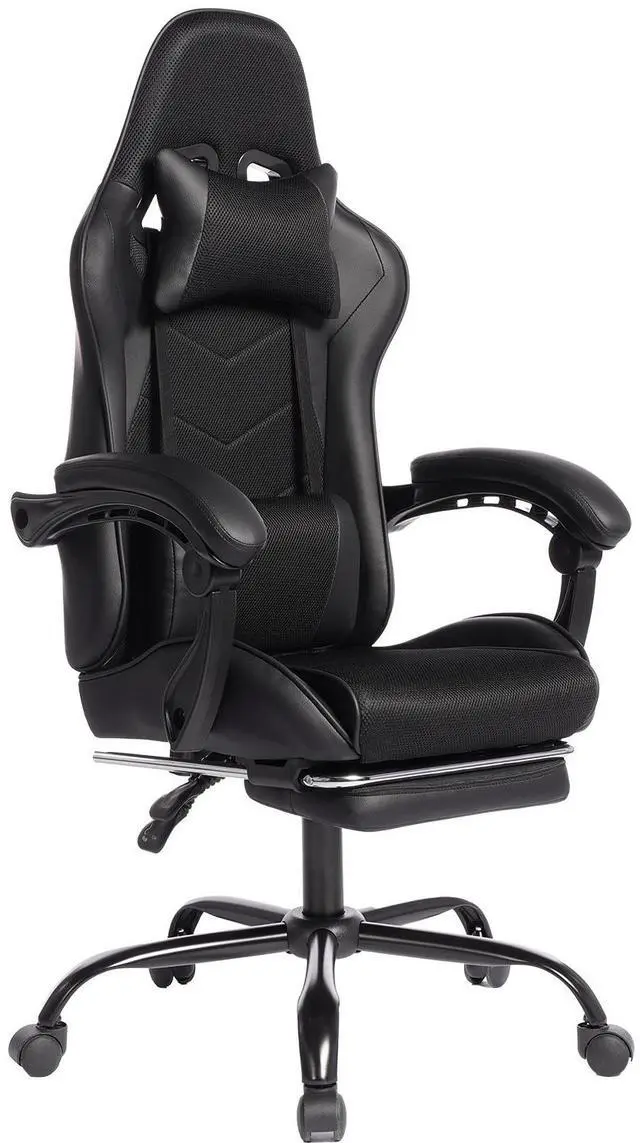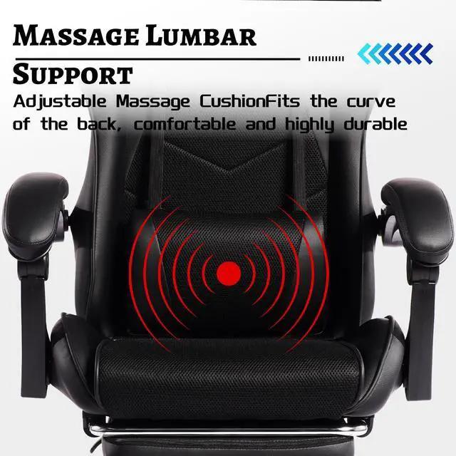 Safe and Comfortable Seating ExperienceThe gaming chair is equipped with a headrest and lumbar support cushions. Using these cushions can reduce strain on the neck and waist. The headrest supports the head, distributing its weight and alleviating neck strain. Especially for those who frequently play games in a reclined posture, even when the backrest is tilted back, the head and line of sight remain fixed at an angle that is easy to view the screen. The lumbar support cushion helps to stretch