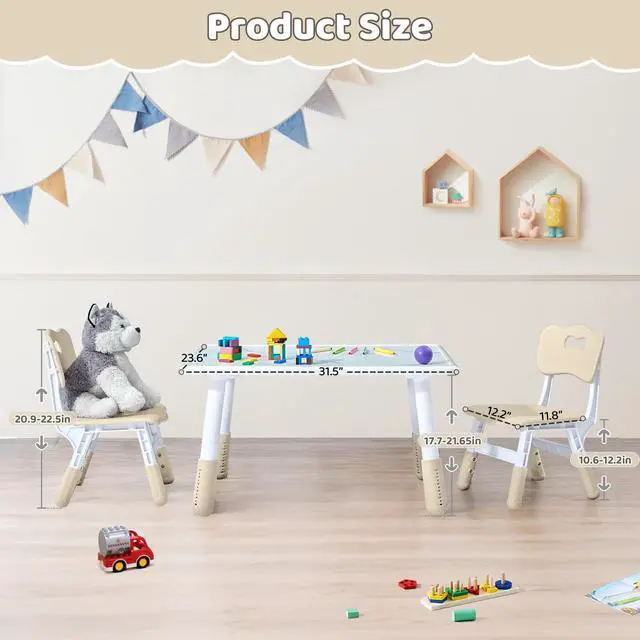 Height Adjustable-No Tools Required for Table: This toddler table and chair set features an upgraded height adjustment method. The table can be adjusted to any height within the range of 17.7-21.65 inches without the need for tools. The chair offers three adjustment levels within the range of 20.9-22.5 inches using screws.