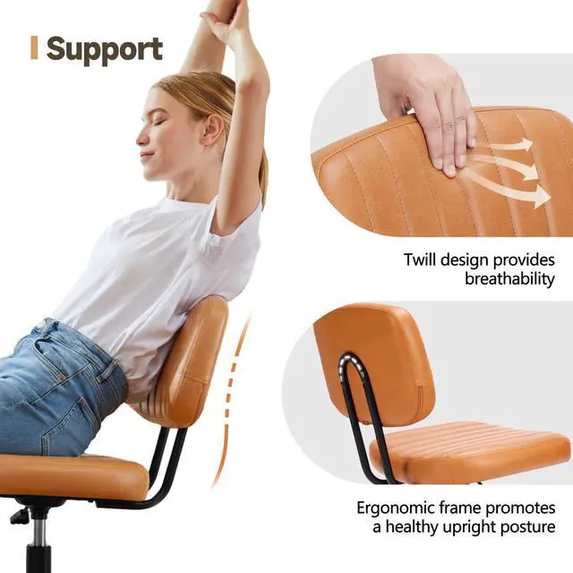 Armless Office Chair, Swivel Rolling PU Leather Vanity Chair with Back Lumbar Support Height Adjustable Computer Chair, Small Desk Chair for Home Office (Brown)