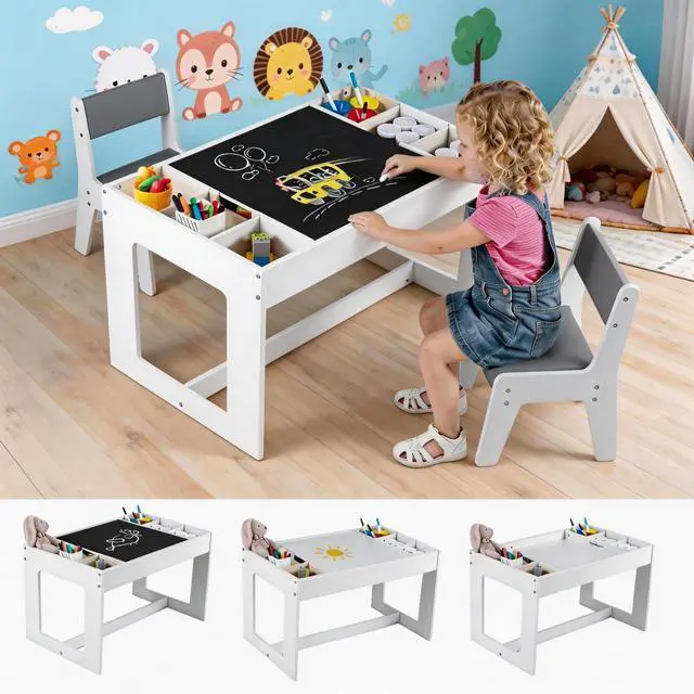 Costzon Table and Chairs for Kids 2-5, 4-1 Wooden Activity Art Desk Set w/Whiteboard, Chalkboard & Storage Cubes for Drawing, Crafting, Playing, Toddler Table and Chair Set (31.5 x 19.5 x 19,Gray)