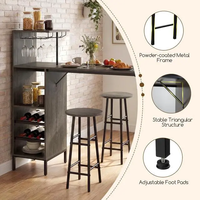 Practical Wine Rack & Glass Holder: Unlike most other pub sets, this bar table and stool set features a glasses holder and a 2-tier wine rack to store 6 wine bottles and various glasses. Additionally, you can classify items by means of 2-tier storage shelves, such as dishes, cups, and snacks.