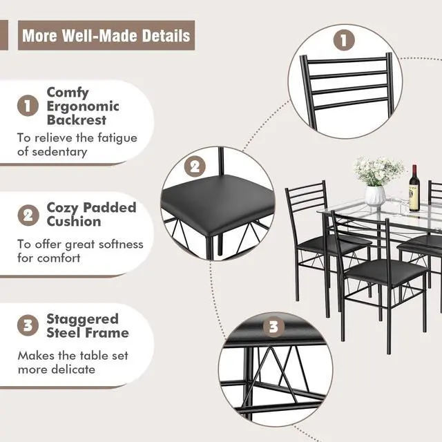 High-Quality Material and Firm StructureThis tabletop is made of tempered glass that is sturdy and durable. Constructed by premium metal frame, this set will provide you years of reliable use. The joint is fixed by high quality screw and connected tightly to strong load-bearing capacity. This set can meet your daily life easily.