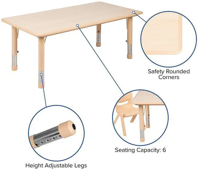 Kids classroom table: 1" thick smooth top with safety rounded corners, 220 lb. static weight load