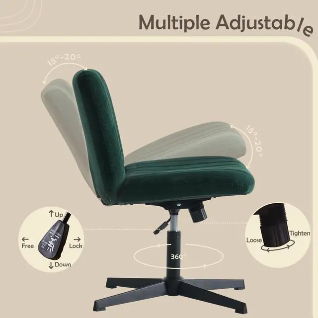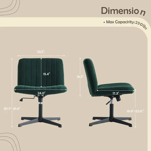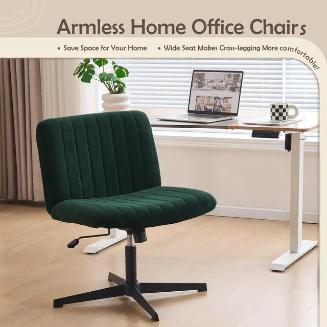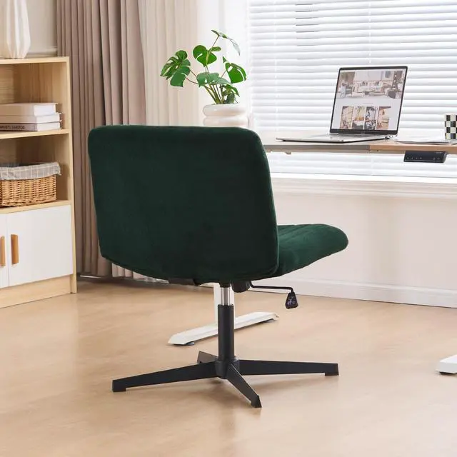Criss Cross Legged Office Chair no Wheels Upholstered Wide Seat Armless Desk Chair Height Adjustable Swivel Computer Chair for Home Office, Bedroom, Makeup, Dark Green