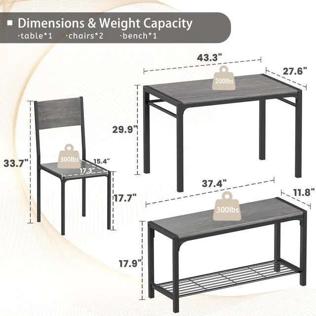 Space-Saving Dining Set - The modern 4-person dinette comes with a rectangular dining table, 2 wooden chairs and a bench, creating the perfect dining experience for friends or family, the chairs and bench can be moved underneath the table after dining. In addition, the design of the storage shelf under the bench will provide more storage space for your daily necessities.