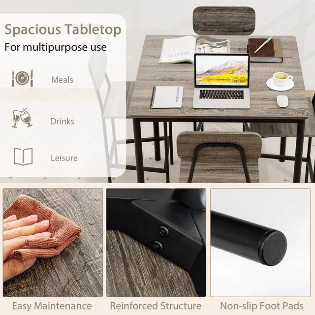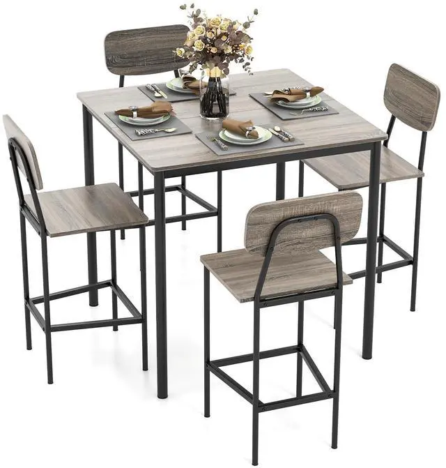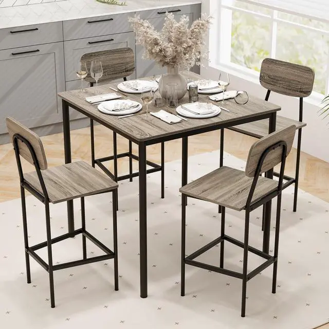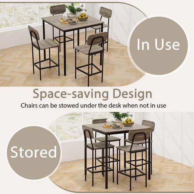 5 PCS Counter Height Table SetThe dining table set includes a counter-height dining table and four bar stools, providing a perfect setting for enjoyable dining or drinks with family and friends. The clean lines and elegant wood grain finish of the industrial table set allow it to seamlessly complement any room decor.