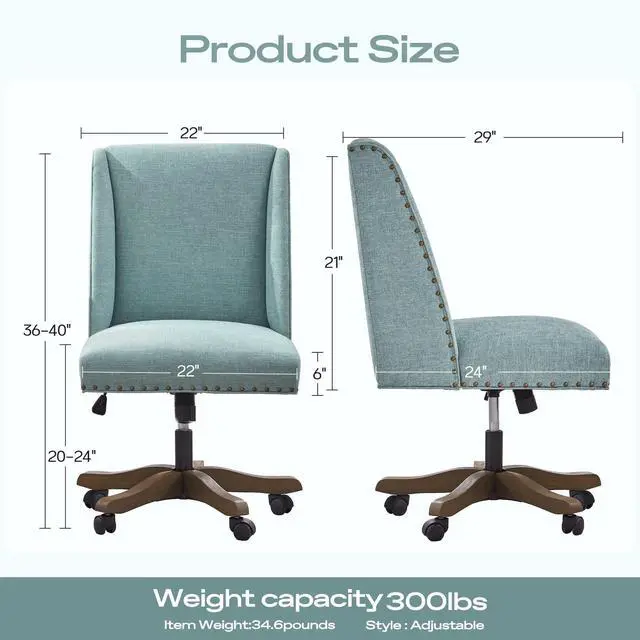 Product Dimension: This upholstered office chair offers a spacious seating area. Overall dimensions (including armrests): 22.6 W x 23.6 D x 36-40.35 H with a maximum weight capacity of 300 lbs. Suitable for users of all sizes and shapes