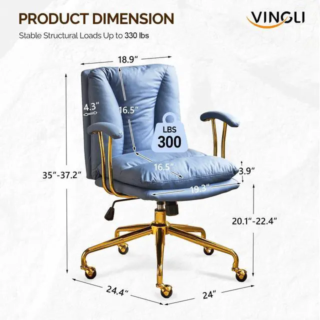 1. Comfort & High Quality : This ergonomic desk chair features elegant gold metal armrests with upholstered pads,premium scratch-resistant PU/Microfiber and a 3.9" thick high-density elastic memory foam, providing comfortable support with a 16.5" mid-back design. The sturdy base is built to last, with an SGS-certified gas lift that loads up to 330.7 lbs. Ensure comfort and durability for long time use, giving users the best quality sitting experience.