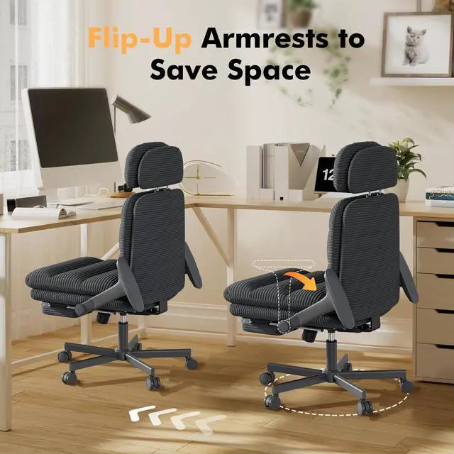 Criss Cross Chair with Flip-Up Armrests: The desk chair features armrests that can flip up 60°, which alllows you to sit more freely cross your legs or easily stow under your desk to save space. The armrest can also be adjusted up and down, slide back and forth, 43° rotate left and right. The 4D armrests can be positioned to suit your preference, rest your arms on the soft padded armrests for extra support; Desk chair size : 20.5"D*22.2"W*42.1~46.1"H; Weight Capacity: 380LBS