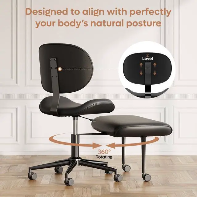Cross-Legged Office Chair with Footrest, PU Leather Armless Desk Chair, Wide Padded Seat for Cross Leg Sitting, Adjustable Height & Swivel, Modern Home Office Chair, Black