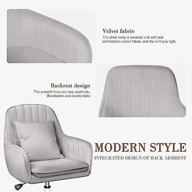 Mid Back Velvet Vanity Chair Swivel Rolling Desk Chair with Wheels, Modern Upholstered Makeup Chair for Women Girls, Computer Task Chair for Bedroom Living Room Office, Gray