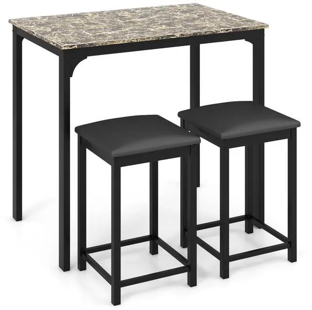 Giantex Dining Table Set for 2, Counter Height Bar Table with Faux Marble Pattern Tabletop, 2 Padded Bar Stools, Footrests, Metal Frame, Dinette Set for Kitchen Small Space Breakfast Nook Pub, Brown