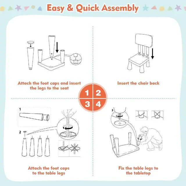 Easy of Cleaning and Assembly: The smooth surface wipes clean effortlessly with a damp cloth, making maintenance a simple task. This square nursery furniture ensures that your child's play and study area is always ready for action. Setting up toddler table and chairs are a breeze, thanks to the clear instructions.