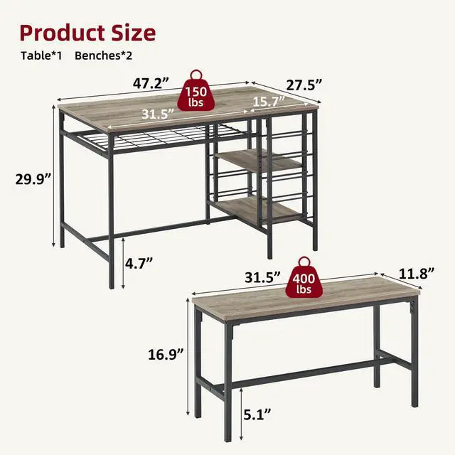 Sturdy Construction: Constructed from iron and thickened MDF, this dining table set for 4 has a reinforced structure. The waterproof tabletop supports up to 150 pounds, while each bench holds up to 400 pounds for durability