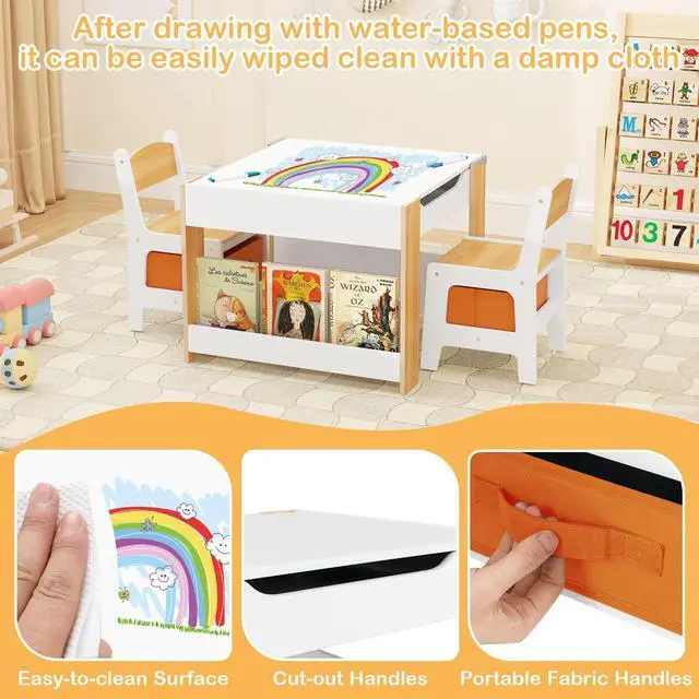 4 in 1 Kids Table with Shelf: The table top of this activity table is reversible, one side is whiteboard, which is easy to clean and can be used for reading, coloring and eating. The other side is a chalkboard, so your kids can draw with chalk and unleash their imagination and creativity. When the table top is removed, it creates a table with an compartment that allows kids to play with toys, make art crafts or build blocks. Side shelves can be used as bookshelves.