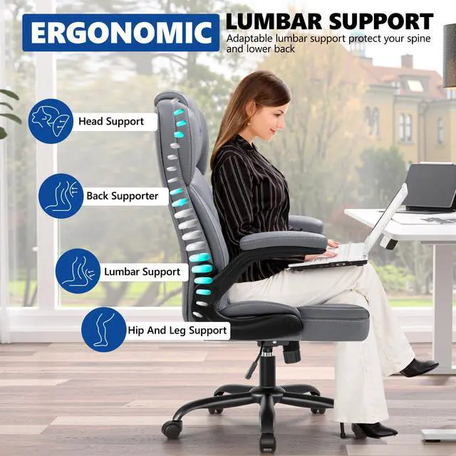PU Leather Executive Office Chair, Ergonomic High-Back Computer & Gaming Chair with Adjustable Height, Rolling Swivel & Flip-Up Armrests, Comfy Padded Seat for Home Office-Gray