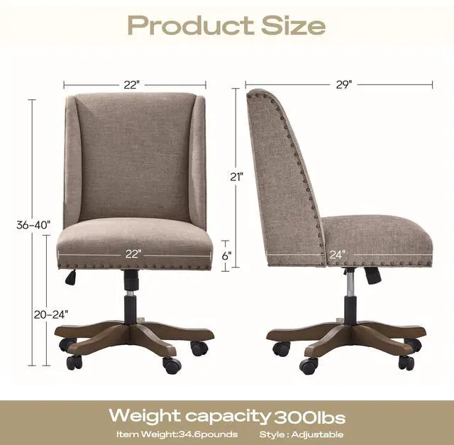 Product Dimension-This upholstered office chair offers a spacious seating area. Overall dimensions (including armrests): 22.6 W x 25.5 D x 37-40.35 H with a maximum weight capacity of 300 lbs. Suitable for users of all sizes and shapes.