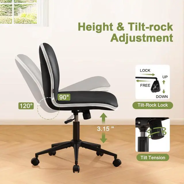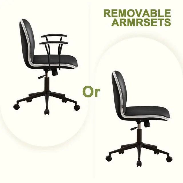 Furniliving Home Office Desk Chair, Modern PU Leather Vanity Chair with Removable & Padded Armrests, Adjustable Height Rolling Swivel Task Chair with Silent Wheels, Black
