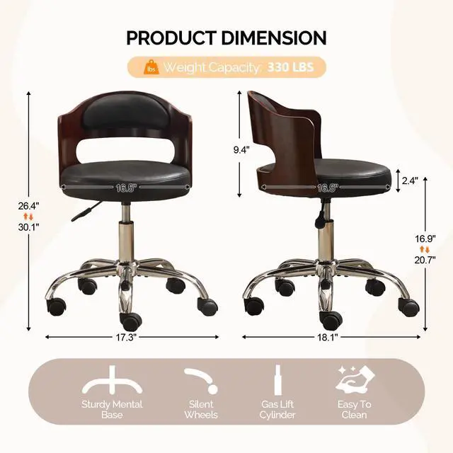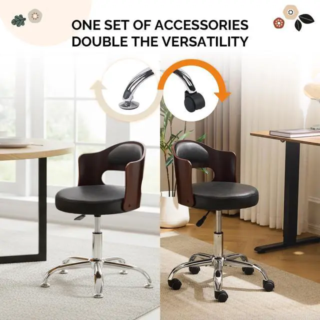 Stylish DesignThis retro designed swivel chair features a beautiful walnut finish, the curved backrest with open-work design adds a sleek modern touch while ensuring breathability. Upholstered in classic PU leather, it offers timeless elegance and skin-friendly comfort. The laminated wood base perfectly complements the leather, creating a timeless look that elevates any home office. Stylish and versatile, it fits seamlessly into any space, making it a great addition to your workspace.