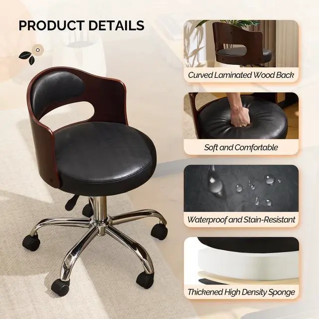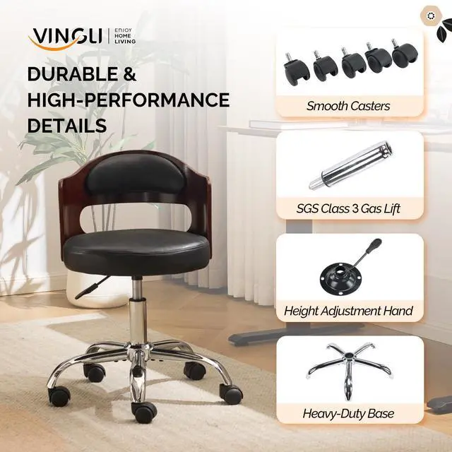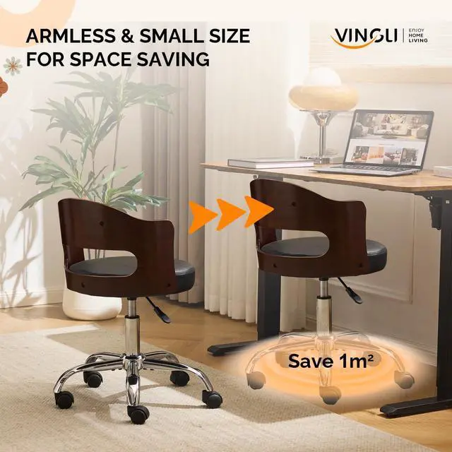 VINGLI Armless Home Office Desk Chair, Adjustable Swivel Chair,Dual-Use with/no Wheels,Small Retro Designed Walnut Curved Task Chair,Cushioned Nail Tech Chair for Study Area,Workspace,PU,Black