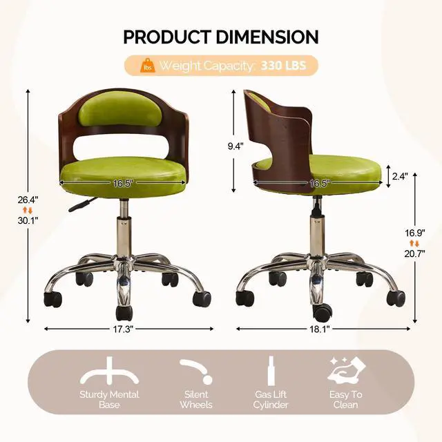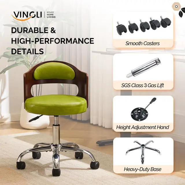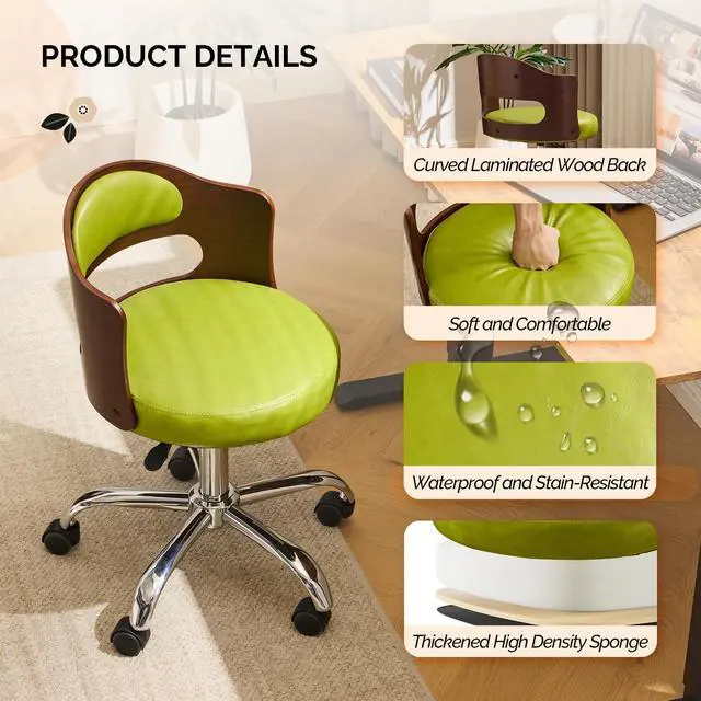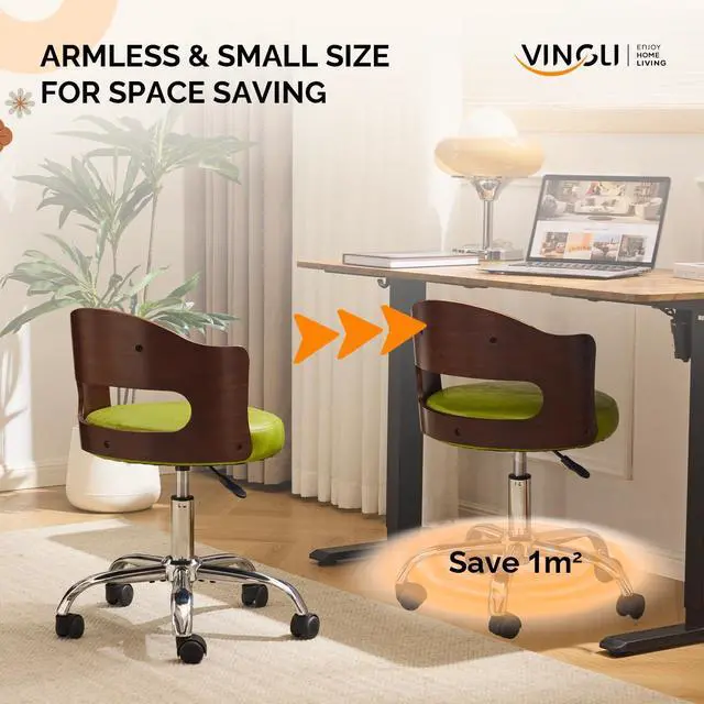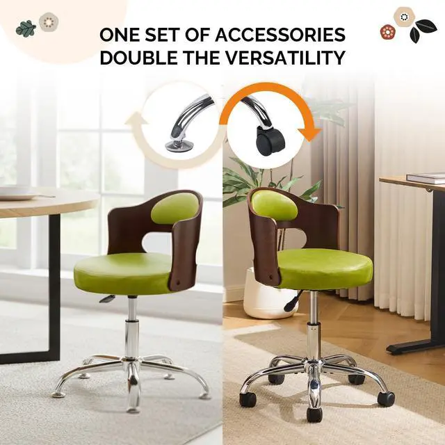 VINGLI Armless Home Office Desk Chair, Adjustable Swivel Chair,Dual-Use with/no Wheels,Small Retro Designed Walnut Curved Task Chair,Cushioned Nail Tech Chair for Study Area,Workspace,PU,Grass Green