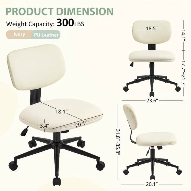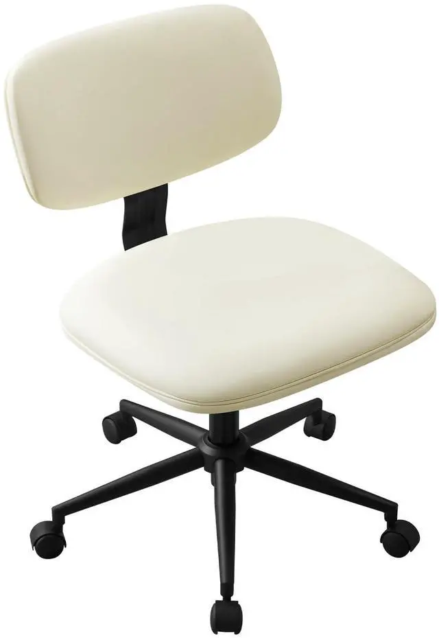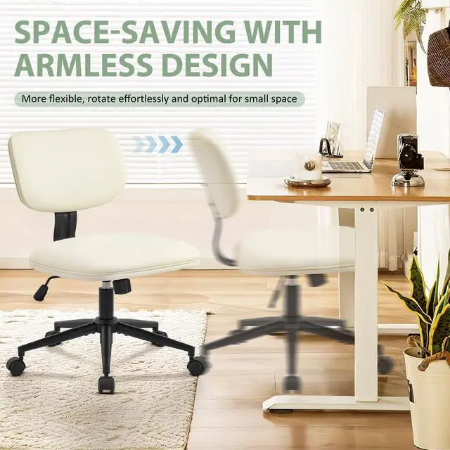 Armless Desk Chair 20" Wide, Home Office Chairs No Arms with Wheels, Leather Upholstered Cute Vanity Chair with Back Swivel Rolling for Bedroom Makeup Study Small Spaces, PU Cream Beige