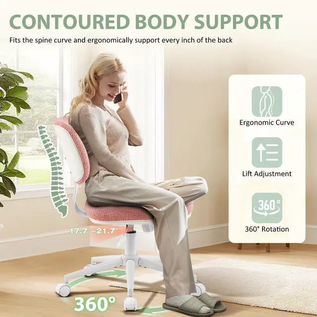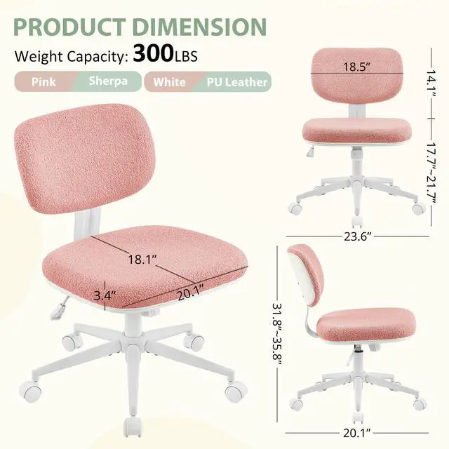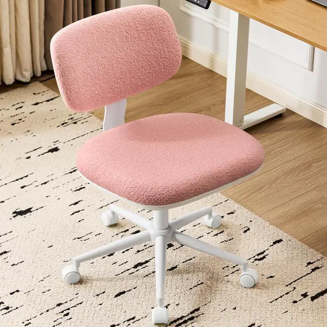 Home Office Chair No Arms with Wheels, Armless Desk Chairs Comfy Cute Pink Vanity Chair 20.1" Wide with Back Lumbar Support, Adjustable Height Swivel Rolling for Bedroom Makeup Study Small Spaces