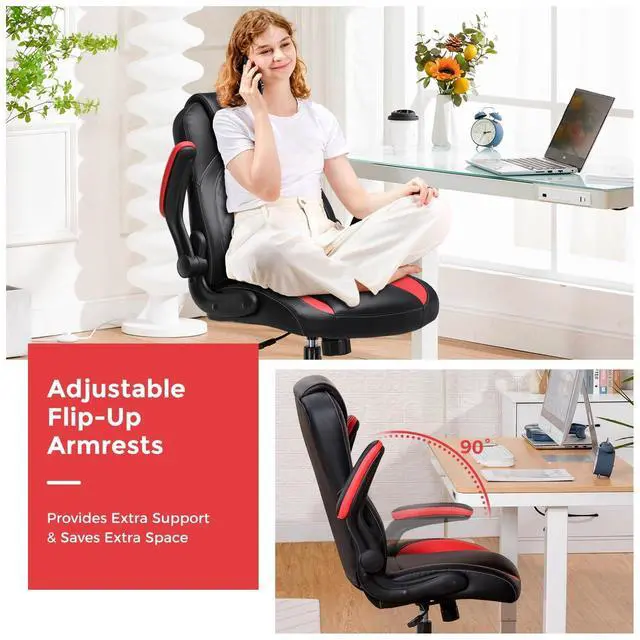 COMHOMA Office Computer Gaming Chair Ergonomic Desk Chair for Adults with Lumbar Support Flip-Up Arms Adjustable Height Swivel Wheels PU Leather Executive Design for Short People Use, Red