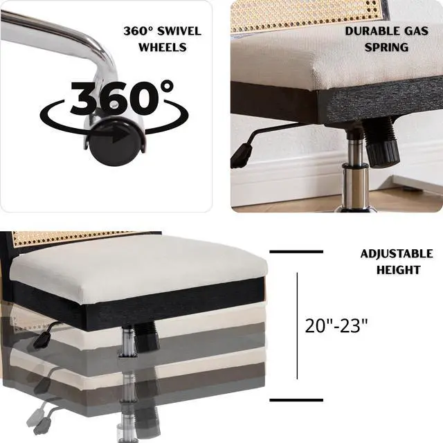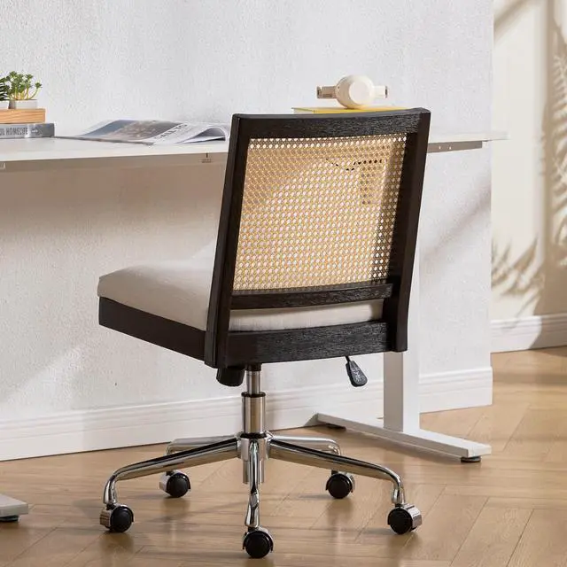 RIVOVA Rattan Desk Chair Linen Fabric Upholstered Computer Office Chair, 360° Swivel Work Chair with Wheels Comfortable Armless Chair for Home Office Study Studio, Beige