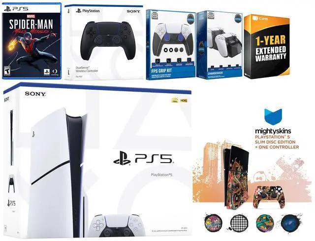 Sony PlayStation 5 Digital, 2x Controllers, Spider-Man Miles Morales, FPS Grip Kit, Controller Charge Dock, MightySkins Code, and 1 Year CPS Extended Warranty