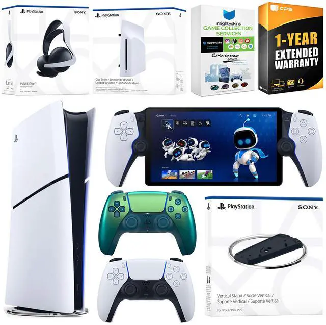 INCLUDED: Sony PlayStation 5 Digital, 2x Controllers, Disc Drive Attachment, Pulse Elite Wireless Headset (White), PlayStation Portal, Sony PS5 Vertical Stand, HDMI cable, AC power cord, MightySkins Game Collection Services and 1 Year CPS Extended Warranty
