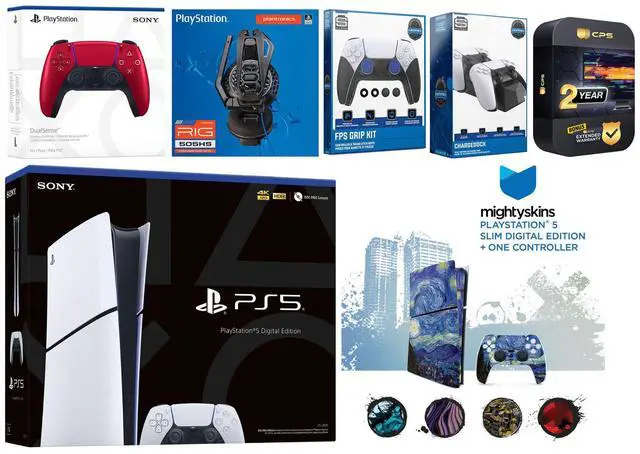 Sony PlayStation 5 Slim Digital Console, 2x Dualsense Controllers, Plantronics RIG 505 HS Gaming Headset, FPS Grip Kit with Precision Aiming Rings, Dual Controller Charge Dock, MightySkins Console + Controller Decal Code, HDMI cable, AC power cord, USB cable, and 2 Year Extended CPS Warranty
