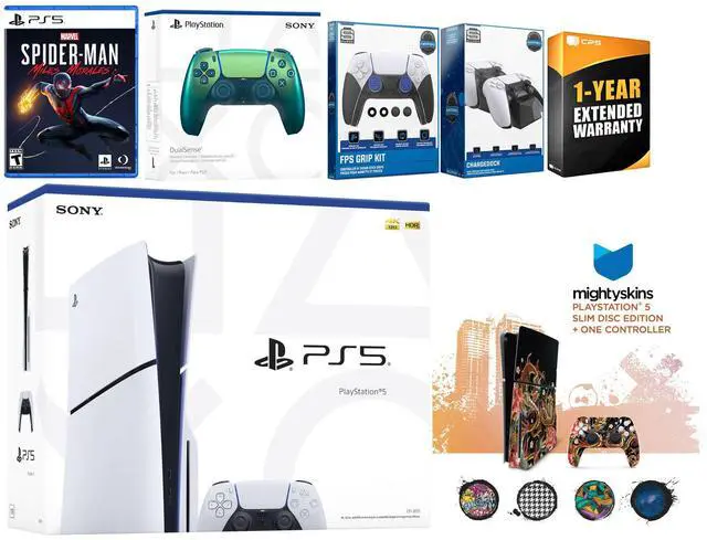 Sony PlayStation 5 Digital, 2x Controllers, Spider-Man Miles Morales, FPS Grip Kit, Controller Charge Dock, MightySkins Code, and 1 Year CPS Extended Warranty