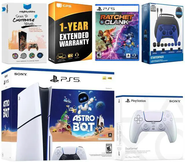 INCLUDED: Sony PS5 Disc, 2x Controllers, ASTRO BOT Download, Rachet and Clank Disc Game, Pro Gamer Kit, MightySkins code, CPS 1 Year Protection Plan